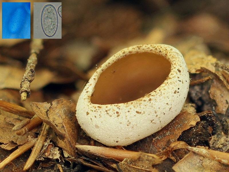 Hallo! Gestern habe ich diesen Becher gefunden. Er wuchs auf einem sehr kurzem Stiel an einem ZweigimBoden unter einer Buche. Die Aussenseite ist weiss gesprenkelt, die Innenseite ocker. Er ist 2 cm lang. Porusreaktion deutlich blau. Die Sporen messen 17-20 x 8-9,5µm und sind sehr fein warzig. Kurz nach dem Auspacken aus Alufolie hat er nach Kartoffelkeimen gerochen. Einen Test auf Milch habe ich beim Aufsammeln vergessen. Heute war nichts. Hat jemand eine Idee? lg Jürgen