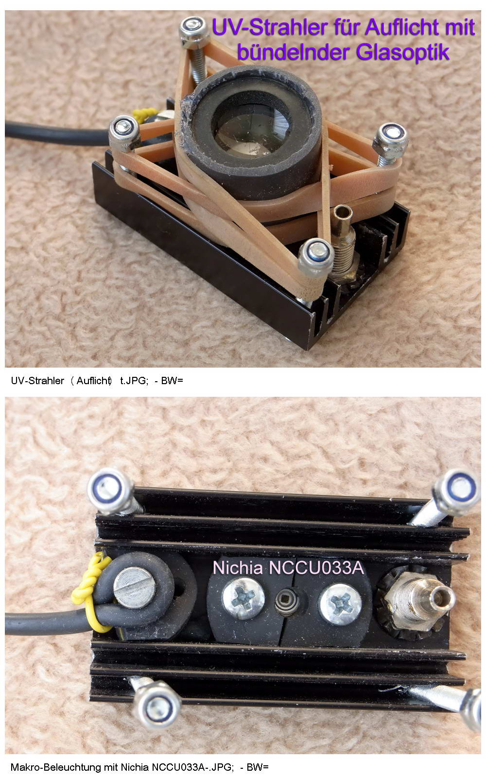 so ist es.. Bei der Nichia UV-LED leuchtet ein winziger Punkt in eine Richtung und kann noch mit Glasoptik gebündelt werden. Das ist somit ein sehr effizienter UV-Strahler (@365nm) mit einem sehr schmalen Spektrum (etwa +/- 5 nm) und es gibt fast kein sichtbares Licht mehr - was anderseits sehr gefährlich für die Augen ist, denn man sieht nicht beim Hineinblicken wieviel Strahlung dort abgeht. Beleuchtet man aber weisses Papier, dann ist man sofort stark geblendet.. (!!! Achtung, das ist kein Kinderkram !!!). :(Woran siehst du, dass ich eine C4500 habe?). an den Metadaten (E4500). Hab die auch. Das ist eine gute Kamera, weil alt und mit UV-unempfindlicher CCD .... ;-). : Ich