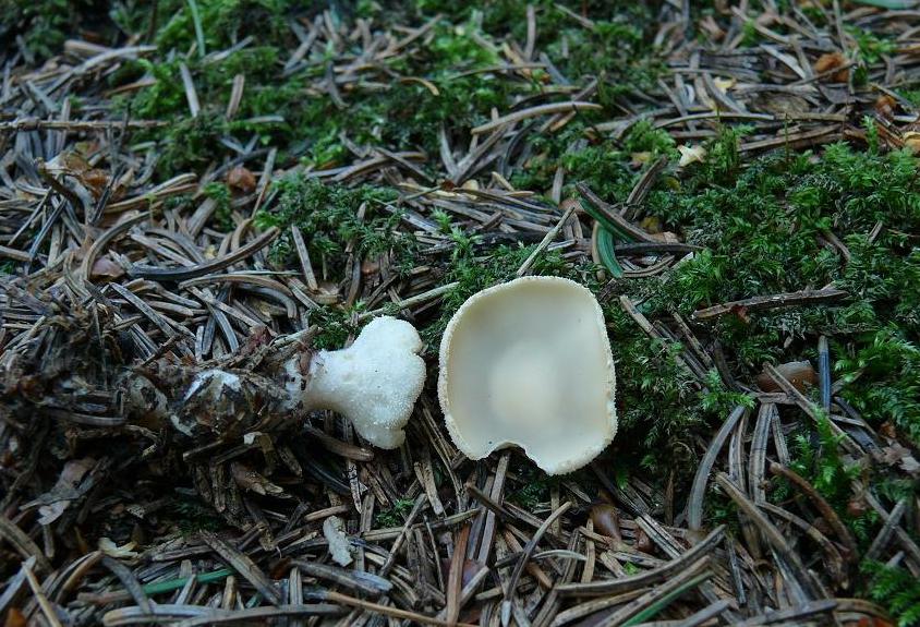 Gestern fanden wir in der Nadelstreu von Fichten (1 Birke in einiger Entfernung)diese fast weißen Becherlinge, wo die Stielspitze des unterirdischen Stieles durchscheint. Der Boden dort ist nicht gewachsen (Altbergbau). Der Fk hatte einen Durchmesser von ca. 2,5cm, der Stiel von 0,5cm und war etwa 2cm lang.