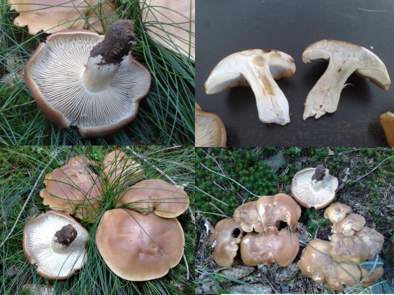 Hallo Zusammen, diese schönen Kandidaten fand ich vor zwei Tagen im Odenwald. An der Stelle befanden sich ca. 20-25 Fruchtkörper. Mit dem Schlüssel komme ich da leider nicht zufriedenstellend weiter. Wenn ich viele Augen zudrücke, käme ich auf Tricholoma imbricatum. Damit kann ich mich aber leider nicht wirklich anfreunden. Ich weiß, dass braune Ritterlinge oftmals ziemlich schwierig zu bestimmen sind, aber vielleicht hat ja jemand eine Idee. Kann mir bei solch stattlichen Exemplaren immer gar nicht vorstellen, dass die keiner kennt. Bin für jeden Tipp dankbar. Viele Grüße Michael Beschreibung: Hut: bis 10cm, ocker-bräunlich, zum Rand hin heller, gänzlich glatt, NICHT schmierig, gedellt, Rand lange eingerollt Lamellen: zunächst weiß, beim trocknen leicht ocker-grau verfärbend, am Stiel ausgebuchtet angewachen Stiel: 1-1,5 x 5-7cm, weiß, leicht bräunlich überhaucht, zur Spitze hin weiß-schuppig Geruch: frisch leicht mehlig, später eher unspezifisch Geschmack: mild, auch im Nachgeschmack mild bleibend, mehlig, an Getreide erinnernd Spp: weiß Trama: weiß, mit Eisensulfat grau-olivgrün, mit KOH gelblich-bräunlich verfärbend (Foto) Standort: Odenwald, Fichten-Tannenwald, Wegrand