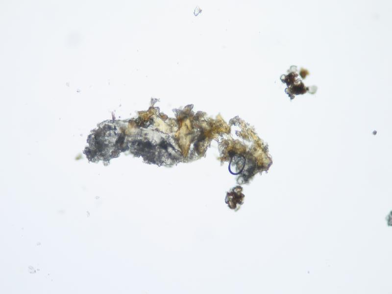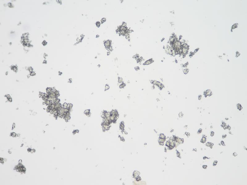 Es ist also nicht F. cinerea, sondern F. septica. Fragt sich nur, ob F. septica var. flava/septica mit weißem Befall oder F. septica var. candida mit gelbem Befall, wobei letztere Variante wegen der pulverartigen Konsistenz der gelben Substanz wahrscheinlicher ist. Allerdings ist die Cortex für F. septica var. candida schon ganz schön glatt. Also habe ich das gelbe Pulver und die vermeintliche Cortex untersucht: Gelbes Pulver (Konidien):