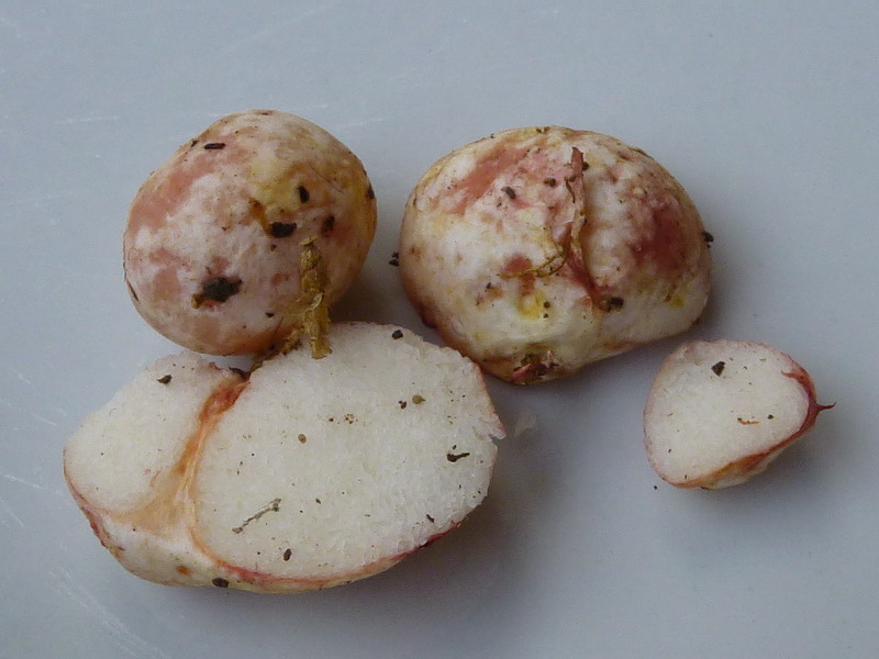 Liebe Pilzfreunde diese schönen Kullern habe ich am Freitag in einem Kalkkiefernwald gefunden. Nach den Sporen her könnte das eine Wurzeltrüffel sein. Die Pilze waren anfangs schneeweiß und verfärben sich schnell. n8i Hartmut