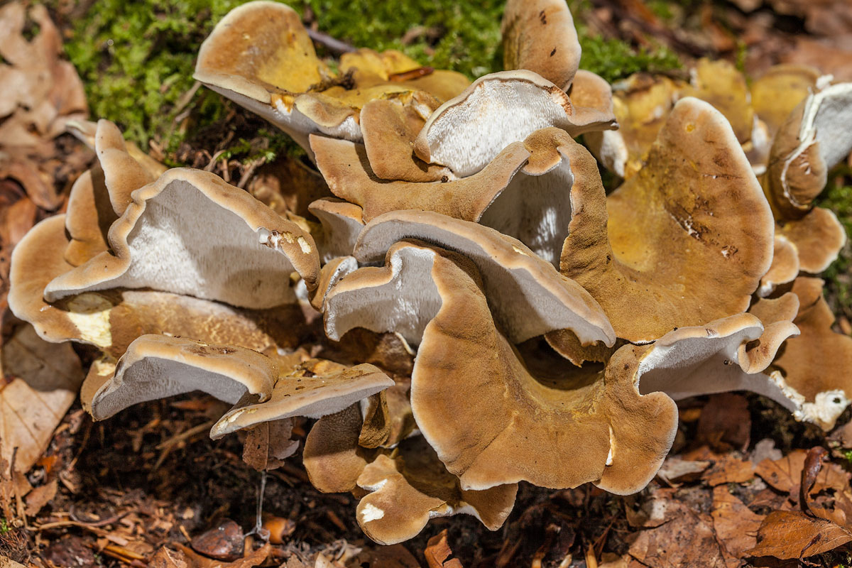 In einem schattigen Rotbuchen-Jungwald (Dickkicht, natürlich aufgelaufen) fand ich heute viele solche Gruppen dieser großen Fruchtkörper: oberseits olivbraun, fein samtig, jung mehr gelbgrünlich, unterseits weiß. Lederige, derbe Textur.