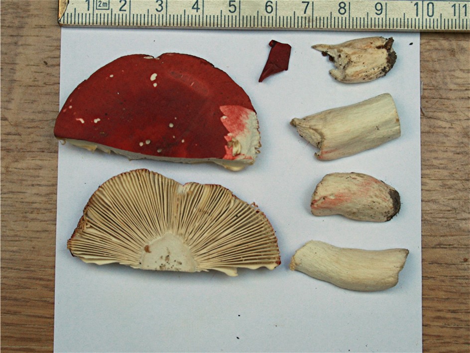 Irgendwie passen diese Merkmale zu keinem der roten Täublinge, von denen ich Beschreibungen fand. Entweder müsste er nach was Unangenehmen schmeckten oder die Huthaut sollte klebrig sein oder das Sporenpulver ocker... Der Sporenabdruck befindet sich tatsächlich mit auf dem Foto - unter der umgedrehten Huthälfte! Könnt Ihr mir weiterhelfen? Grüße - Rika