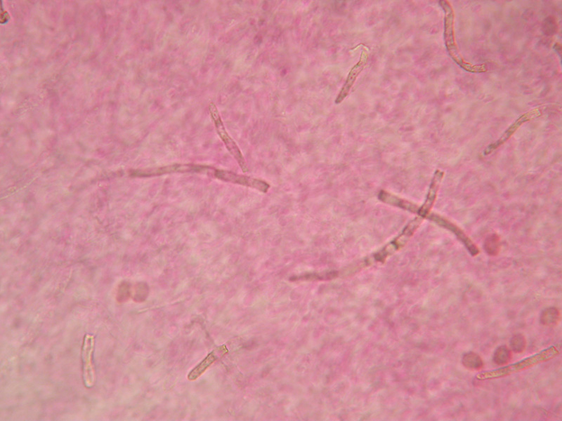 Hallo Stephan, diese "Strukturen" waren schon deutlich dunkler als der Rest der HDS. Hier nochmal ein Foto. Allerdings sind die alle apikal zylindrisch bis konisch, nicht keulig. Irgendwie habe ich immer noch Schwierigkeiten Primordialhyphen von Pileozystiden zu unterscheiden. Der Pilz war klein, ca. 4 cm Hutdurchmesser und hatte dottergelbe Lamellen. Die Sporenpulverfarbe kann ich nicht genau beurteilen, da er nicht mehr voll abgesport hat. Er ist während dem Absporen eingetrocknet. Es ist aber ein deutliches gelb mit orangener Komponente. ochroleuca dürfte vom Standort her ausscheiden. Viele Grüße