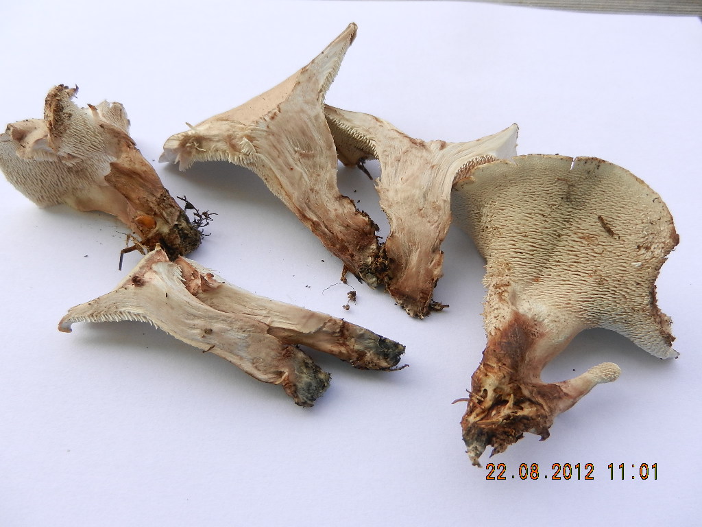 Das müsste Bankera cinerea sein. Ich stutze deswegen, weil die Stielbasis dieser Exemplare blaugrün war, so wie z. B. bei Sarcodon glaucopus. Der Geschmack war allerdings völlig mild, und der Maggigeruch schon an den Frischexemplaren deutlich vorhanden. Dieser Pilz trat dieses Jahr in relativ großen Mengen auf und stand in jedem Wald herum, in dem ich unterwegs war.