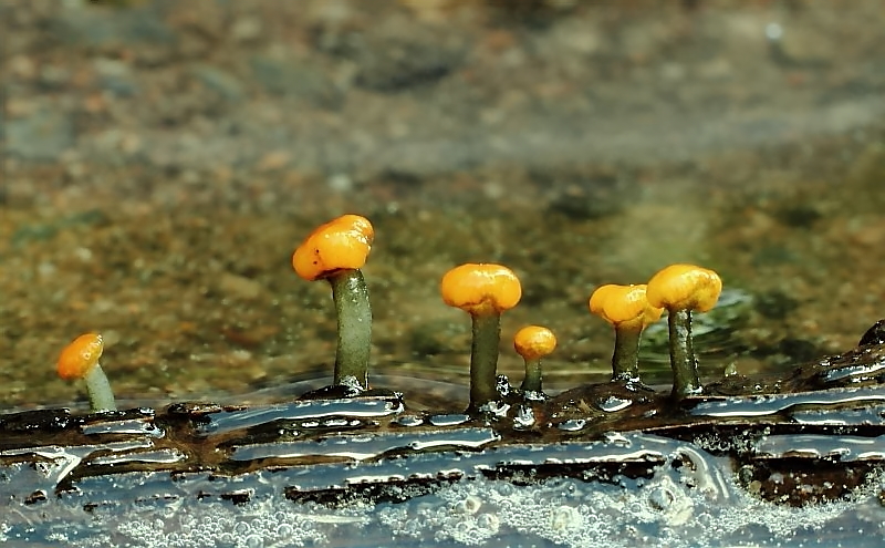 wenn es Euch wieder "bächelt", dann achtet doch mal auf andere feucht bis untergetauchr wachsende Arten, die mitunter garnicht so selten sind. Die folgene Art wird es bei Euch wohl kaum geben, da müßt Ihr wahrscheinlich schon in den Harz, den dieses gestielte Fadenscheibchen verträgt keinerlei Verunreinigung des Wassers und auch keinen Kalk. Die anderen ( ungestielten)Vibrissea (Apostemidium)- Arten haben es gern auch etwas nährstoffreicher.