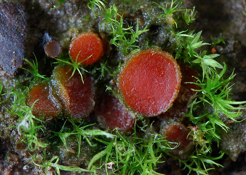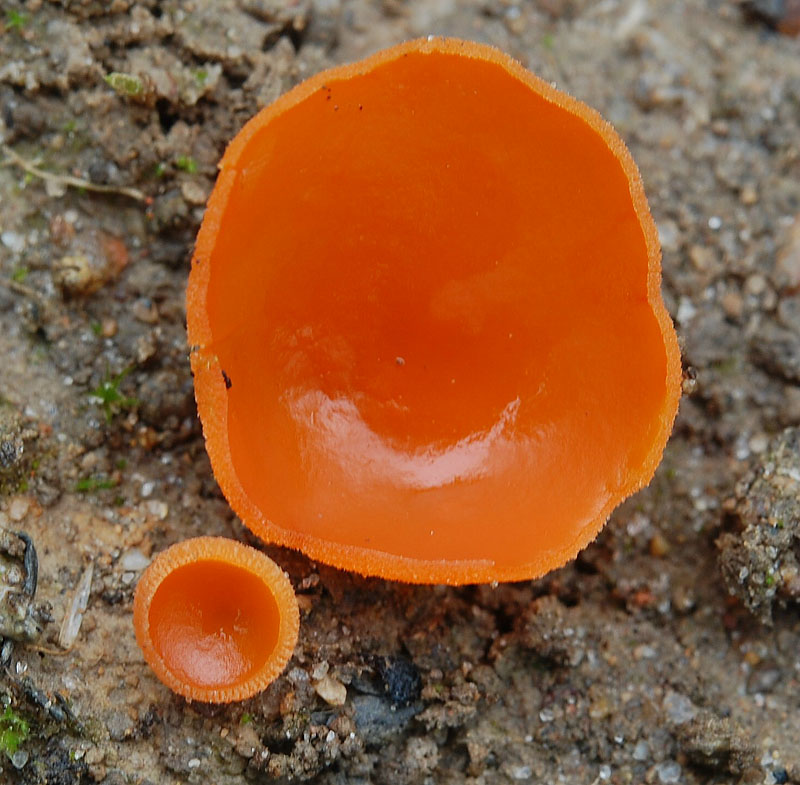 Genug Gelb und Lila. Die tonige „Waldwegschlucht“ änderte ihre Farbe. Orangerote Becher, z.T. noch etwas jugendlich, vergnügten sich und nannten mir ohne langes Drohen ihren Namen. Aleuria aurantia. Den kennt man.