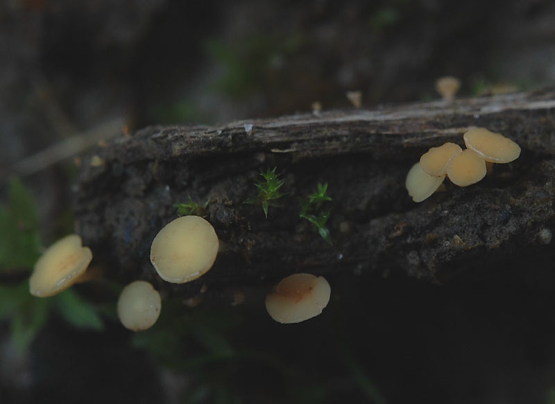 Noch beschäftigt mit der Ernte der Scutellinen, hat das nimmersatte Auge auch schon wieder etwas erspäht. Diesmal waren es kurzgestielte Becher von ockergelblicher Farbe. Hymenoscyphus scutula, einer unserer häufigsten inoperculaten Ascos hat es sich auf Stängelresten von Cirsium bequem gemacht. Die kleine Becherschar zersetzt gemeinsam das krautige Substrat und unter dem Mikroskop sind die Sporen sehr markant. 20- 22 x 4- 5 µm und mit 3- 4 großen und etlichen kleinen Guttulen sind typisch für die Art. Die Sporenform ist scutuloid und die meist kurzen Zilien an den Sporenenden kann nicht jede Spore vorweisen. Ein gutes Merkmal bieten auch die hakenlosen Asci.