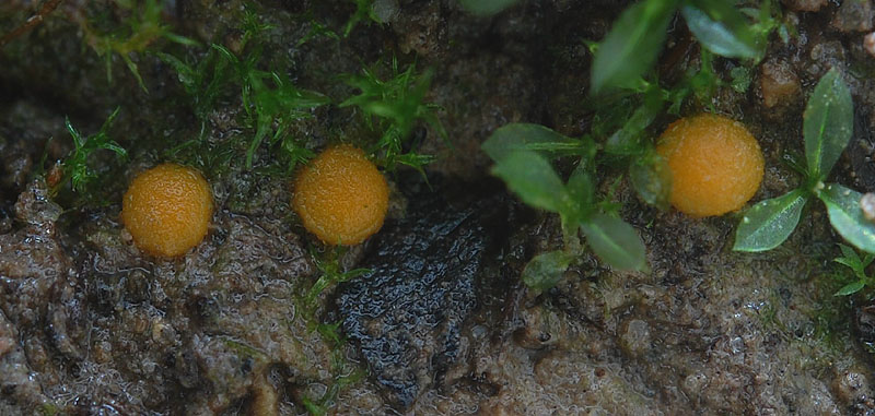 "Zu Besuch im Grand Canyon der Ascos- eine Reise durch eine mecklenburgische Waldwegfurche" Sonntagmorgen so zwischen Frühstück und Gänsebraten noch mal ein halbes Stündchen in den Wald. Hurra! Wir los und ab in einen mecklenburgischen Buchenwald bei Rehna. Die Messer gewetzt und der Korb gelüftet und dann: nicht ein Hutpilz. Nicht einer! Was tun? Lupe raus, abknien und dann ab in die nasse lehmig-tonige Waldwegfurche. Schöne Moose gab es im Mikrodschungel z.B. Dicranella heteromalla, Atrichum undulatum, Marchantia polymorpha und auch Pseudephemerum nitidum. Das angespannte Auge eines alternden Pilzonkels quält sich mächtig und dann endlich geht es los. Gelbe Punkte, eingebettet in Moosprotonema und zwischen „niederen Dattelpalmen“. Den hatte ich schon lange nicht mehr. Das letzte Mal war es wohl in Norwegen. Rambsbottomia crec´hqueraultii. Die Art hat schöne gleichmäßig bestachelte und auch kleinere Sporen als Rambsbottomia macracantha, so liest man bei ENGEL & HANFF 1987. Unsere morgensternartigen Sporen waren meist 25- 26 µm im Durchmesser, inklusive der Stacheln wohlgemerkt. Die Stacheln waren zudem nicht länger als 3- 4 µm. Also ziemlich sichere Sache. Einige Ascomycetologen haben macracantha übrigens auf den Status einer Varietät heruntergestuft. Ansichtssache, jedenfalls makroskopisch gibt es Nullchancen die beiden Gesellen auseinander zu halten.