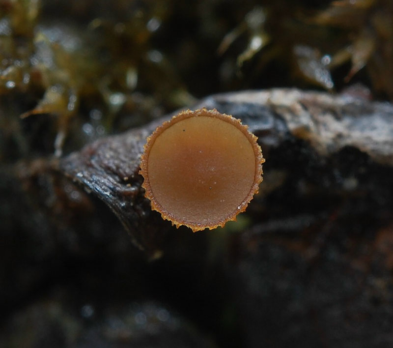 Die Zeit drängte. 30 Minuten in einer Waldwegfurche werden zur Ewigkeit. Da streckt mir Katrin noch einen kleinen, feinbewimperten Becher entgegen. Er lag einsam und verlassen in der Lehmfurche und saß kurzgestielt auf einem vorjährigen Blattstiel von Quercus robur. Rutstroemia sydowiana heißt der braune Asco und wenn er nicht gestorben ist, dann schleudert er noch heute seine Sporen in die weite Welt. Ihr merkt schon es geht zu Ende. Die Sporen waren übrigens 12- 15 x 6 µm groß und im unteren Teil gekrümmt. „Schwager“ Rutstroemia petiolorum hat schlankere Sporen mit meist vielen kleinen Guttulen. Sydowiana hingegen beherbergt 2-3 große Guttulen in den Sporen und bevorzugt Quercus Blätter bzw. Cupulen.