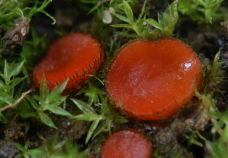 Die rote Farbe würde intensiver und behaarte Becherlinge bekamen unsere Aufmerksamkeit. Aufgrund der meist 300- 450 (-610) µm langen, mehrfach an der Basis verzweigten Haaren, sowie den breit-elliptischen, 17- 19 x 11,5- 12,5 µm großen Sporen stellten wir unseren Fund zu Scutellinia subhirtella. Entscheidend war weiterhin das Sporenornament. Gleichmäßig waren kurze, isoliert stehende Warzen über der Sporenwand verteilt. Gleich in Nachbarschaft schon wieder etwas Rotes. Diesmal kräftig karminrot und eher flach tellerförmig. Die 150- 320 µm kurzen Haare an der Außenseite waren von Schwemmsand und Algenfilz etwas verdeckt, aber in Verbindung mit dem fast gefügelt wirkenden Netz auf den Sporen, war sofort alles klar. Scutellinia pseudotrechispora hieß der 2. Kandidat in unserem „Ascocanyon“.