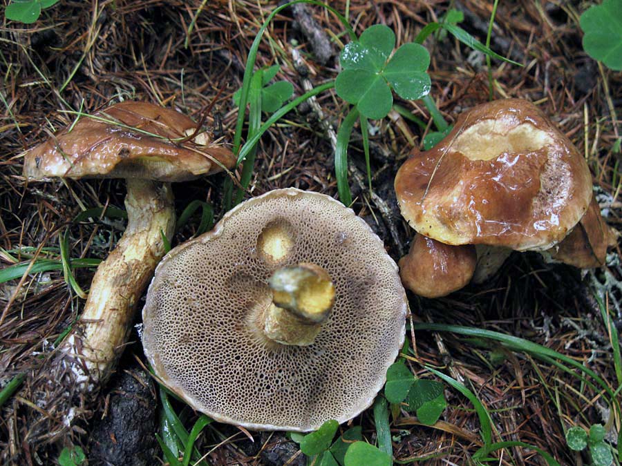 Hallo Jürgen, ich respektiere deine überzeugte Expertenmeinung, möchte dazu aber anmerken: Abgesehen von der gelben Stielspitze und einer leicht gelblichen Stielbasis hatte diese Kollektion nichts Gelbes an sich. An allen Exemplaren, auch bei jungen, war das Velum weiß bis schmutzig weißlich, ebenso das Fleisch (außer in der Stielbasis), die Röhren/Poren grau, zum Rand hin heller (grau), aber nicht gelblich. Ich kenne den typischen S. bresadolae von einigen Funden in den Alpen eigentlich ganz gut, aber das hier passte mir im ganzen Erscheinungsbild gar nicht dazu. Es schaute vielmehr schlicht wie ein "S. viscidus mit braunem Hut" aus.
