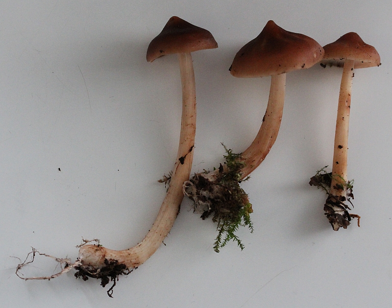 Hallo Pilzlergemeinde, ein Fund aus einem Kalk-Niedermoor, der sich bislang der Bestimmung widersetzt. Eigentlich ein recht auffälliges Kerlchen mit Pickelhaube, aber trotzdem will nichts so recht passen... Die Fruchtkörper wuchsen mit etwa 15 weiteren aus der Basis einer lebenden Schwarzerle und deren Wurzeln. Der linke Fruchtkörper misst ca. 14 cm in der Höhe, wobei knapp 1 cm des Stiels im Holz steckten, wo die Basis mit einem ganzen Bündel aus Mycelsträngen im Holz verwachsen war; ein Teil der Stränge hängt noch am Stiel. Lamellen auch an alten Fruchtkörpern reinweiß (SPP im Abwurf ebenso), Fleisch in Stiel und Hut hellbräunlich, Geruch unauffällig und schwach, Geschmack mild, aber fade. Mikroskopie: keine Zystiden gefunden (wenn, dann höchstens Basidien-förmige Cheilozystiden), Schnallen in allen Geweben vorhanden, Sporen subglobos, 4-5 x 3-4,5 µm, inamyloid. Kennt jemand diesen Holzbewohner? Ich hätte spontan an Collybia s. l. gedacht, aber da passt die Hutform nicht, und auch nicht die abgerundete Stielbasis mit Mycelsträngen. Danke für Hilfen und Hinweise! Schöne Grüße,