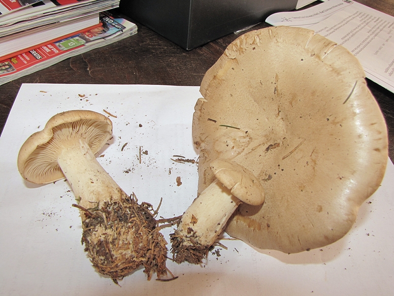 ....gestern hat mich Joschi ins Glastal bei Frankenstein im nördlichen Pfälzerwald mitgenommen. Neben sicher über tausend Exemplaren von C. infractus, Fälblingen und vielen anderen schönen Pilzarten, fiel uns in der dicken Nadelstreu ein halber Hexenring von grossen blassen Trichterlingen auf. Unsere Vernutung Mönchsköpfe scheiterte am Buckel.
