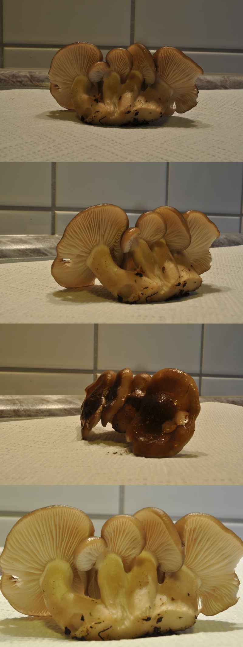 Hallo zusammen, dieser Kandidat wächst neben dem Haus auf eine kleinen Wiese mit Birken und auch Kastanie. Wachstum büschelig, Hut etwas schmierig, dunkelbraun, nach außen hin etwas heller werdend, Lamellen eng stehend, weiß mit gräulich/braunem Schimmer, Geruch etwas muffig (irgendwie nach Camembert), Fleisch sehr knorpelig, Stiel weiß bis hellbräunlich. Mein Tipp: Büscheliger Rasling - Lyophyllum decastes. Oder auch der knorpelige Rasling - L. loricatum?