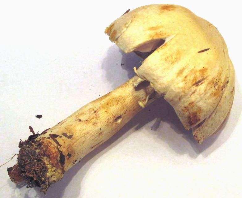 Heute habe ich im Laubwald diesen Pilz gefunden. Die stattliche Größe und der marzipanartige Geruch lassen auf einen Riesenchampignon schließen. Die helle Hutfarbe und die glatte Oberfläche sind hingegen untypisch.