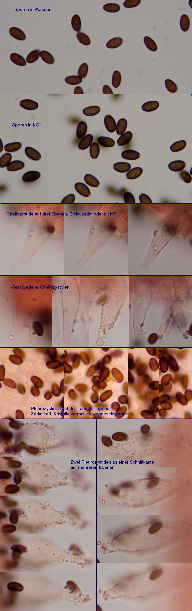 Hallo Andreas! Ich habe mich jetzt nochmal ein wenig um die Pilze gekümmert. Die Sporen als Abwurfpräperat in Wasser gemessen: 9-10 x 5-5,5 µm. Wie hell oder dunkel die Sporen auf einem Bild rüberkommen hängt wohl auch stark von der Belichtungszeit ab. Auf der Lamelle liegend, also mit dunklerem Hintergrund sehen sie deutlich heller aus. In KOH kann man an jeder Spore deutlich einen Keimporus erkennen, den ich jetzt nicht als klein einschätzen würde. Wenn es darum geht die Stärke von Zellwänden einzuschätzen bricht bei mir regelmässig Verzweiflung aus. Je nachdem wo man den Fokus des Mikroskopes hinsetzt schaut das anders aus.