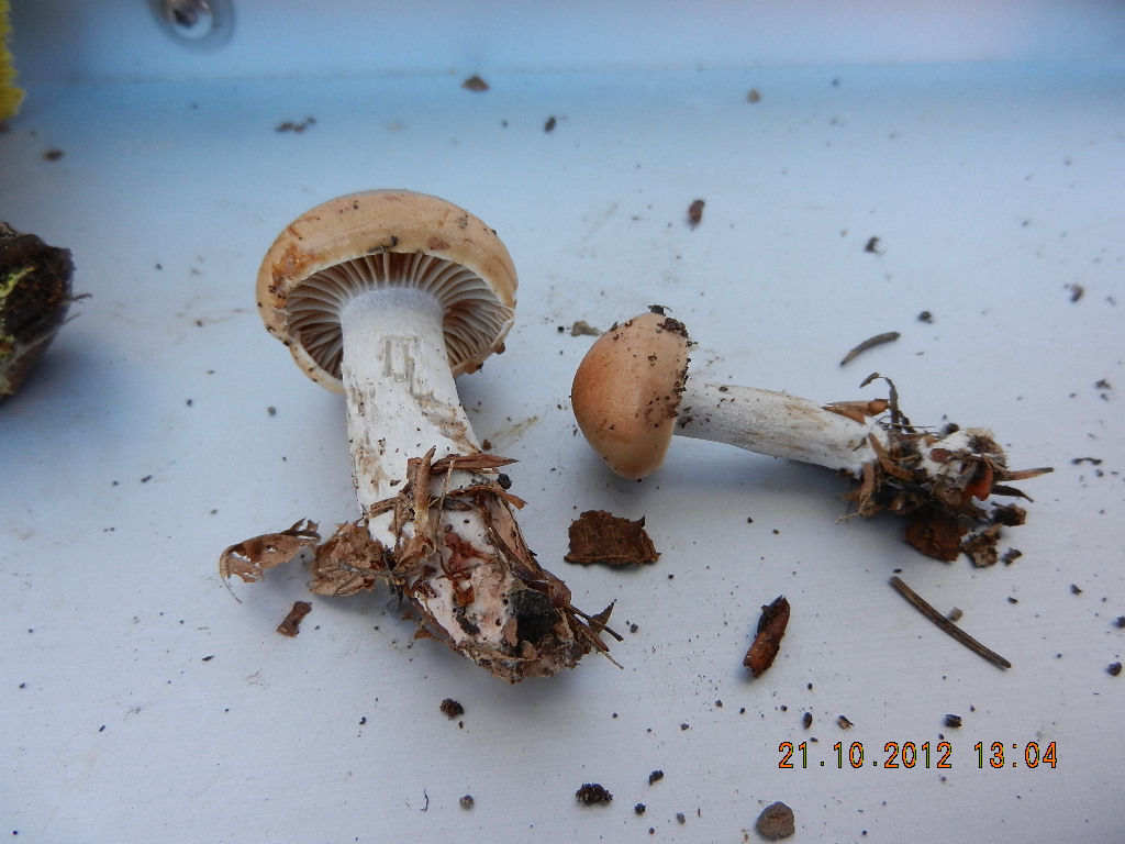 Leider unbestimmt blieb dieses junge Pilzchen von etwa 5 cm Höhe, Hut halbkugelig, 2 cm Durchmesser. Makroskopisch fallen dabei die ziemlich einheitlich fahl orangebraune, glatte aber nicht schmierige Hutoberfläche, die stark bogigen Lamellen (Schneckling??) und der trocken-matte, ausgesprochen kalkweiße Stiel (wirkt wie mit Tipp-Ex überzogen!) mit rötlichbrauner Basis auf. Der Pilz riecht und schmeckt nach absolut nichts, nicht einmal banal pilzig, ist auch nicht bitter. An KOH-Reaktion habe ich getestet: auf der Hutoberfläche graubraun, an der Stielbasis auffallend kräftig kastanienbraun. Der Pilz wuchs im Kalkbuchenwald, in Gesellschaft des Buchenklumpfußes, des Purpurfleckenden Klumpfußes und eines messinggelben Klumpfußes, den ich bisher nicht benennen konnte. Außerdem gab es an dieser Stelle massenhaft Hygrophorus lindtneri, den ich gut kenne. Mein erster Tipp geht in Richtung Schneckling. Aber unter den gängigen Schnecklingsarten finde ich nichts, das so richtig passt. Insbesondere passt er m. E. nicht zu Hygrophorus lindtneri. Wer kann helfen?