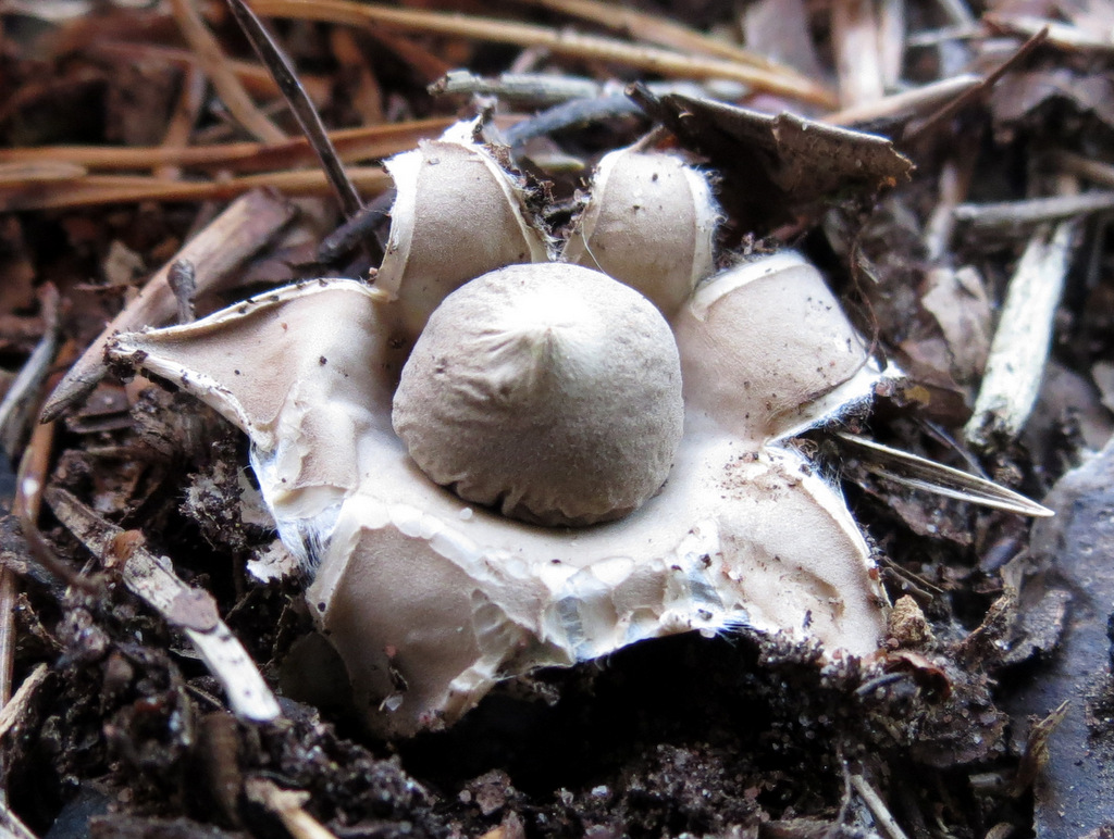 Heute mußte ich mit großem Bedauern feststellen, dass ich 10-14 Tage zu spät dran bin. Es standen Unmengen überständige und monsterhafte Steinpilze, Eichenrotkappen und vieles Andere in der Landschaft rum, schade drum. Dafür waren aber noch prächtigste Flockenstielige Hexenröhrlinge zu finden. Da wir keine Schubkarre mit hatten, beschränkten wir uns auf einige Exemplare in 5 Sterne-Qualität. Zur Overtüre fangen wir mal ganz klein an. 10m vom Parkplatz entfernt ein nicht zertretener gewimperter Erdstern, etwas kleiner als eine 1 € Münze