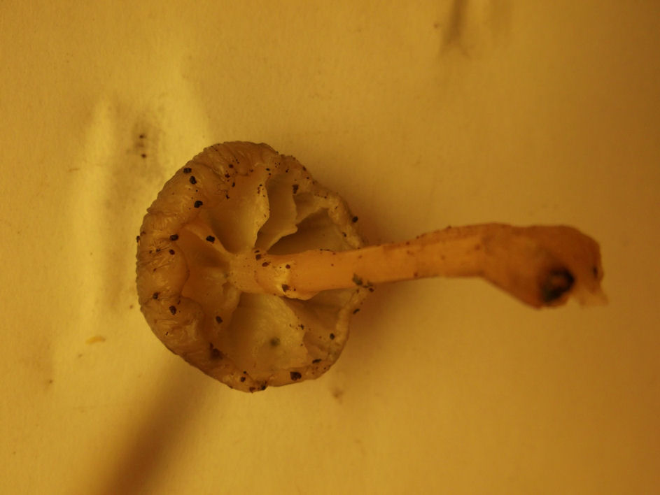 Hut gut 2cm im Durchmesser, Hh glatt, jetzt runzelig, jetzt leicht abschiebbar, Farbe graugrünbeige. Lamellen hell, sehr entfernt, sehr breit, bauchig, breit angeheftet. Stiel glatt, knapp 4cm lang, faserig korpelig, etwas dunkler und als der Hut mit leichtem Rotstich, OF glatt und hängender Ringrest. Geruch unspezifisch gammelig, Geschmack deshalb nicht probiert Mikroskopie war angesichts fortgeschrittener Verwesung unergiebig. Die Voraussetzungen sind also in jeder Hinsicht bestens.... Ich habe in Richtung Marasmius wynnei gedacht. Da werden die Lamellen aber als schmal angeheftet beschrieben und auch der Ring stört erheblich.