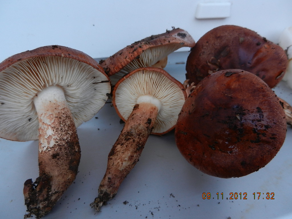 Diesmal aus einem lichten Hain mit Eichen und Buchen, aber garantiert ohne Kiefer, auch nicht in 200 m Umkreis. Diese Stücke rochen beim Aufnehmen außerordentlich stark nach Mehl, also ohne dass man überhaupt die Nase dranhalten musste. Geschmack ziemlich bitter. Wie man sieht, ist die Huthaut maronenbraun, vergleichsweise schmierig und wenig striat. Der Farbübergang am Stiel ist abrupt, aber ohne jede braune Linie (wie z. B. bei T. striatum), und befindet sich sehr knapp (ca. 1 cm) unter der Stielspitze. Das muss dann wohl T. ustaloides sein, den ich peinlicherweise bisher für ein Literaturphantom hielt. Freilich war ich auch noch nicht Mitte November in einem solchen Waldstück.