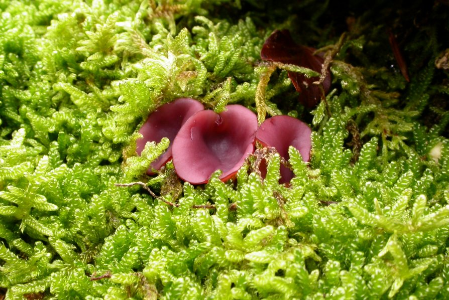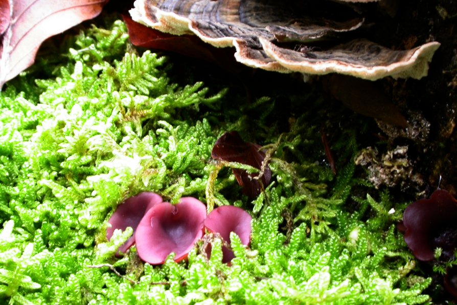 Der absolute Farbtupfer ist dieser kleine Becherling, sattlila leuchtet er aus dem Moospolster.