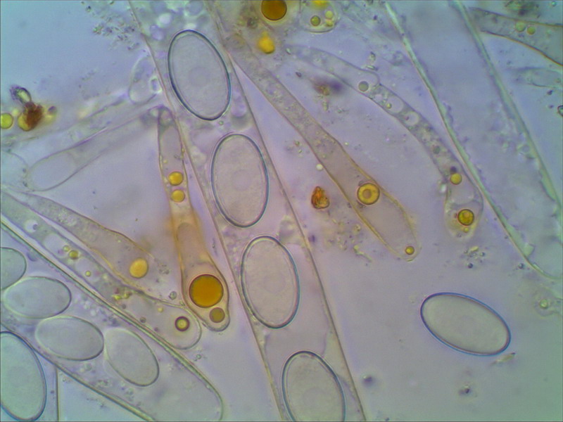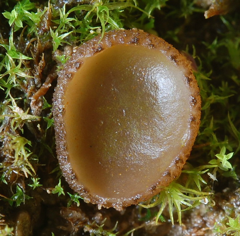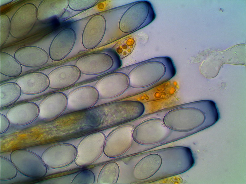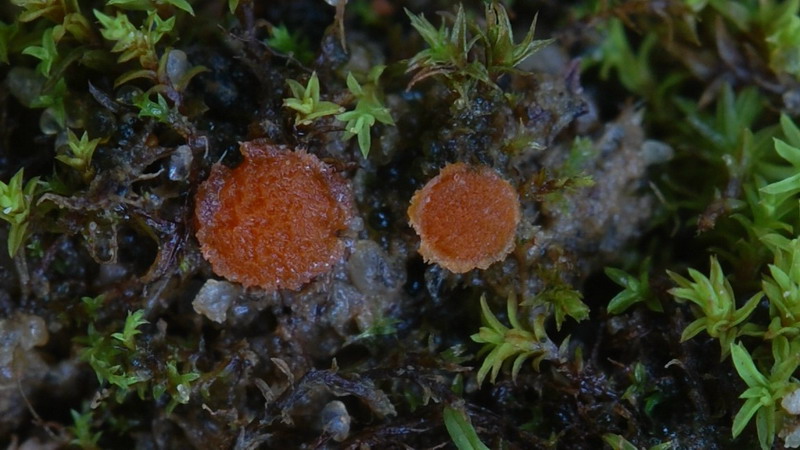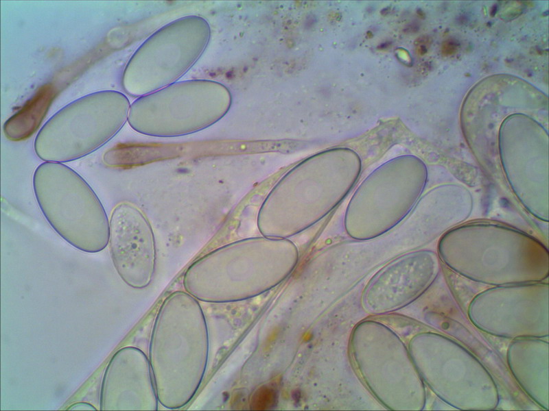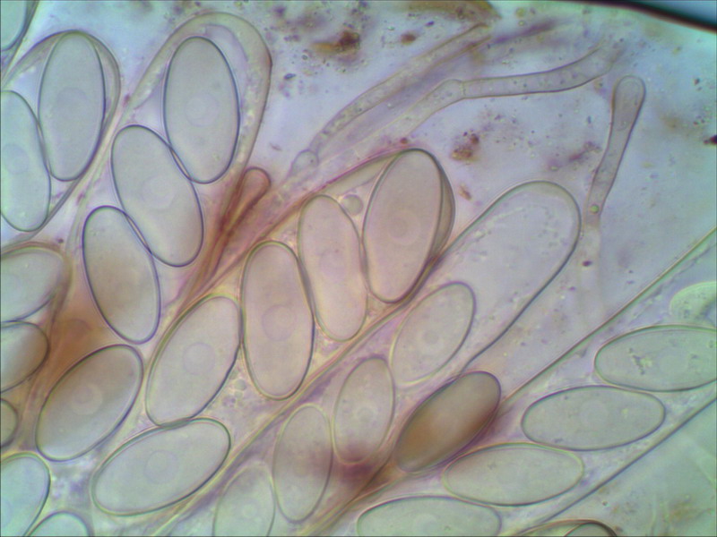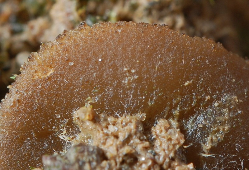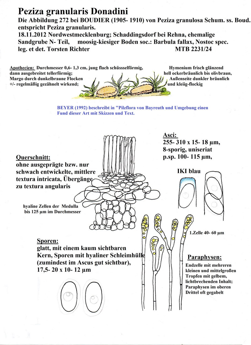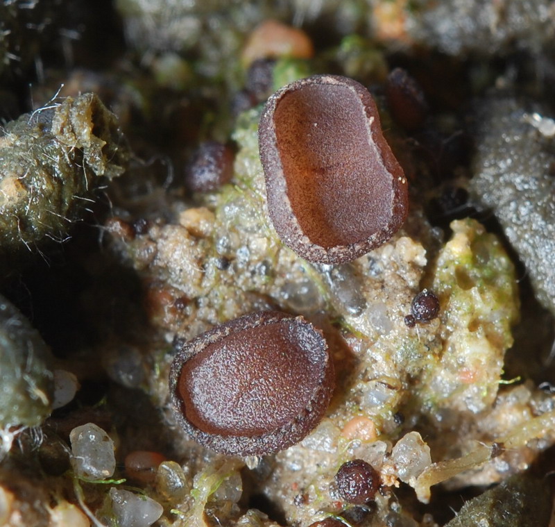Vorbei an vergessenen Zuckerrüben die schon der Frost überrascht hatte wirkte das neblige Grau der Sandgrube nicht gerade einladend, aber die Pilzwelt sollte uns nicht enttäuschen. Echte Octo- und Lamprosporajäger sind halt nicht zu bremsen. Zügig wurde das Auto verlassen und in Lamprohaltung gings robbend durchs Gelände. Omphalina rickenii und hepatica ließen wir hinter uns! Alles viel zu groß und dann endlich! Katrin entdeckte ihn und ich doste ihn ein. Den ersten kleinen braunen Becher des Tages. Ein Arbeitsname war im Kopf und vorbei gings an Peltigerafeldern die von Polycoccum peltigerae befallen waren. Die Peziza entpuppte sich schnell als Peziza granularis. Die markanten Paraphysen und der dunkel gezähnelte Becherrand sind nicht zu ignorieren. Die gelungenen Mikrofotos schuf Hartmut Schubert und ergänzte unsere kleine Doku aus Feinste.