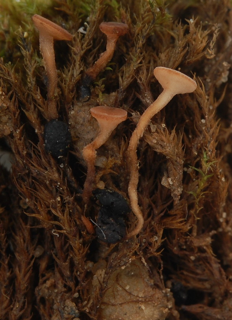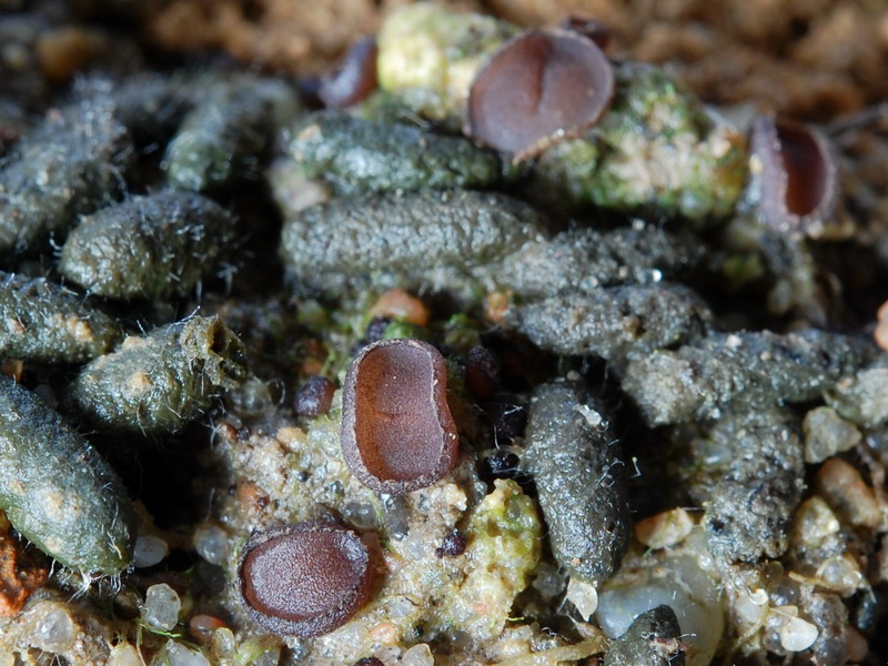 Schei... keine Hasenschei... , aber da lag im Eingangsbereich einer Mausehöhle lauter Kot. Der wurde abgelupt und endlich hatte ich meinen Fund des Tages. Purpurbraune bis violettbraune Becher zwischen und auf den mausgrauen Verdauungsresten von Micky Maus.