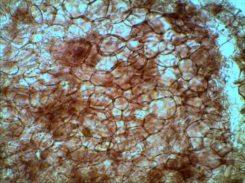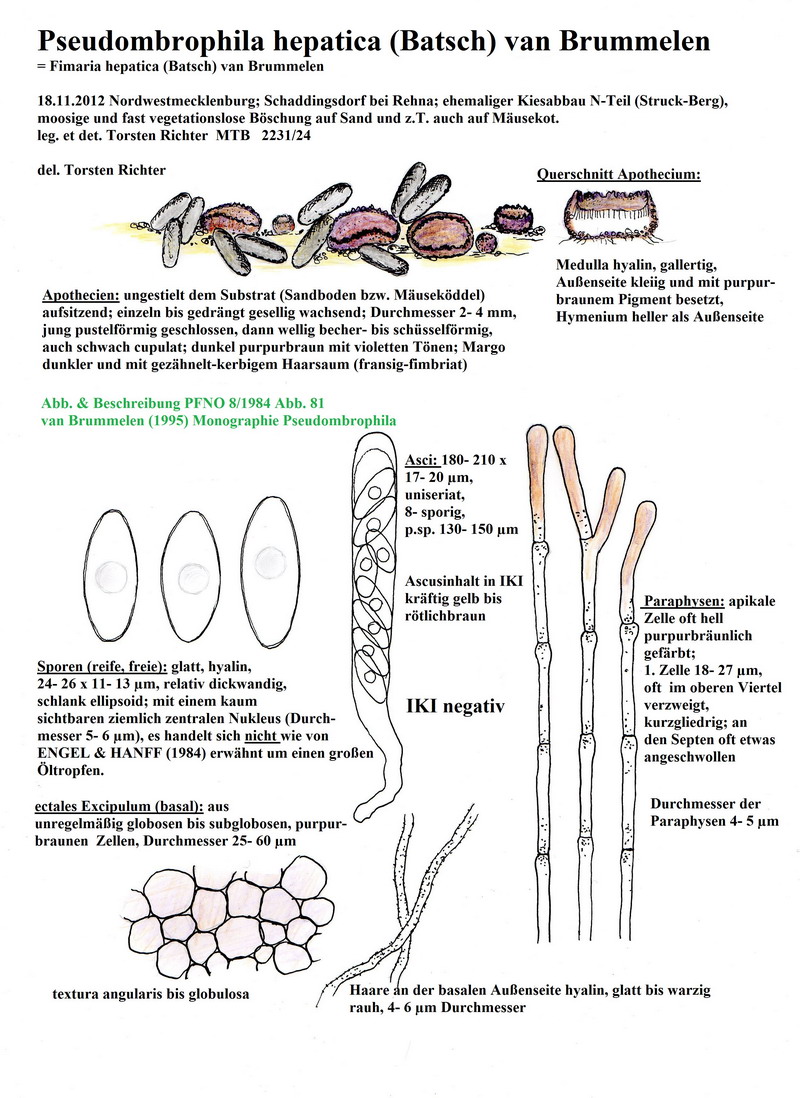 Ich war begeistert und da die Füße auch von Katrin kalt wurden, reichte es für den geordneten Rückzug . An vorjährigen Stängelresten von Tanacetum vulgare gab es dann noch diverse „Schichtpilze“ auf dem Rückweg. Die werden auch oft stiefmütterlich behandelt, aber nicht von uns. Katrin bestimmte sie nach dem Gänsebraten. Einer hieß Rogersella sambuci, früher hieß er mal Lyomyces und wächst eben nicht nur an Holunder sondern sehr gerne auch an Typha latifolia und wie erlebt auch an Tanacetum. Eine Peniophora lycii lebte auch noch von den Stängeln. Kopfzerbrechen bereitet uns noch ein Heterobasidiomycet. Der braucht noch etwas Zeit. Mein gezähnelter „Mäusekottling“ jedenfalls wurde mikroskopiert und gründlich untersucht. Neu für mich, für Germany nicht, Pseudombrophila hepatica (= Fimaria hepatica). Bloß gut das ich Joop van Brummelen (1995) im Regal habe, ich meine natürlich sein Buch. Meine kleine Beschreibung incl. Makrofotos veredelte Hartmut wieder mit erlesenen Mikroaufnahmen.