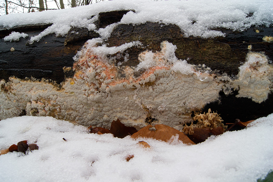 inspizierten liegenden Laubholzstumpf zusteuerte. Ich war sicher, dass die vorjährigenjährigen resupinaten FK