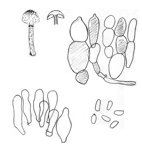 Subglobos bis elliptsich, manchmal auch eizelne Zellen rund. Aber das entscheidende ist, dass Sie in Ketten zusammenhängen und nicht als einzelne perfekt globose Zellen von der HDS ablösen. Anbei Skizzen von Lepiota hystrix, die anderen Arten siond ähnlich im Aufbau. beste Grüße,