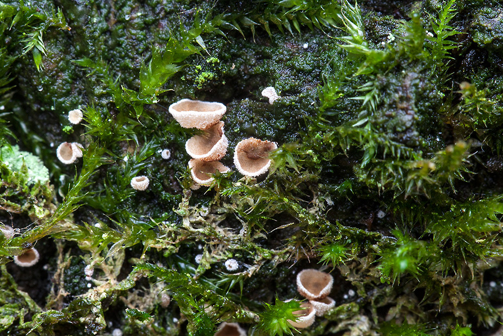 Liebe Pilzfreunde, das neue Jahr fing gleich gut an: auf einer gestrigen Erkundungsexkursion mit B. Grauwinkel und J. Albers im Oldenburgischen fanden wir Chromophylla muscicola (Braunsporiges Flaumschälchen) mit etlichen Fruchtkörpern an einem liegenden Eichenast. LG Hans-Peter