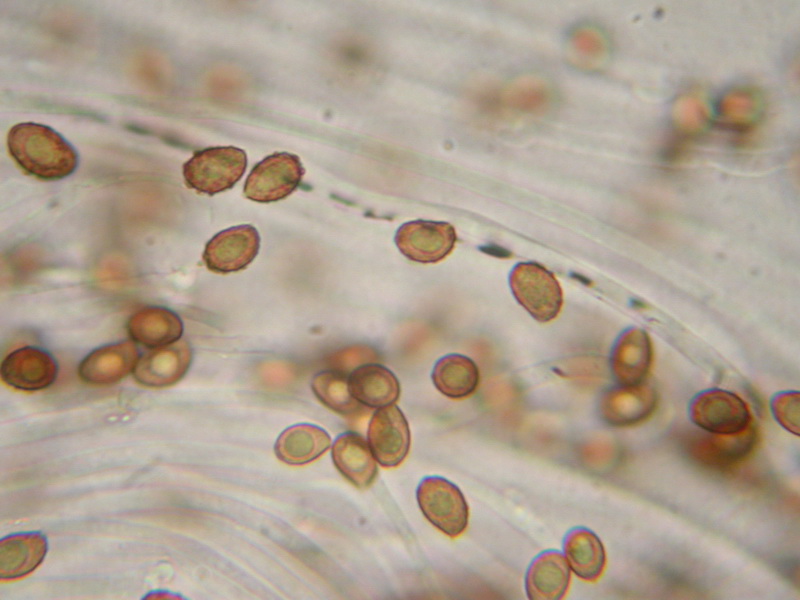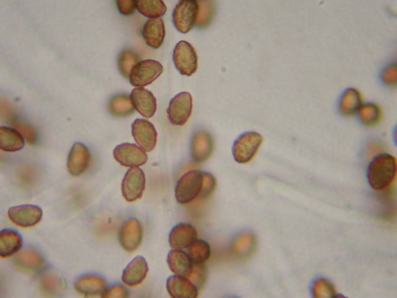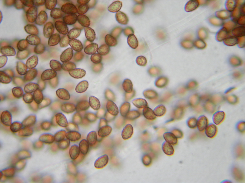 Sporen: ellipsoid bis subamygdaloid, oft mit subapikulärer Depression, Apex mittelbreit bis fast schmal gerundet, nicht sehr dicht, aber grob warzig, Warzen im Umriss deutlich überstehend; Maße: 8,6 x 5,2 (8-9,5 x 5-5,5), Q=1,67 (1,55-1,73), 20 Sp. gemessen;