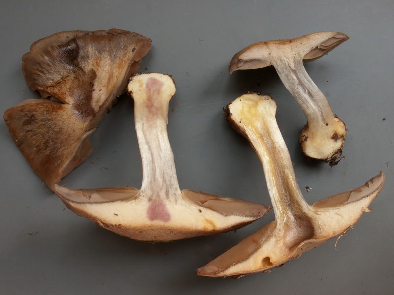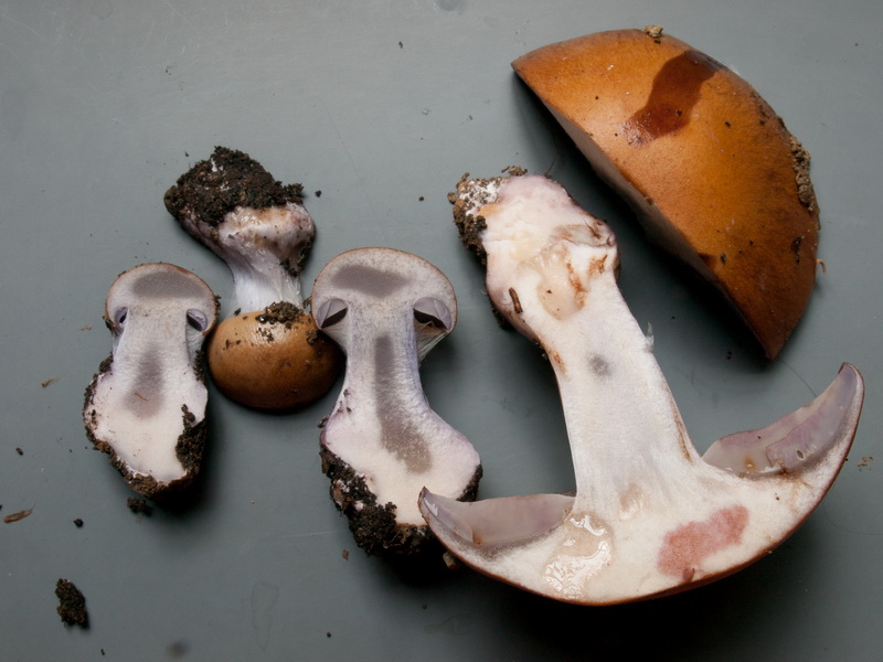 Zur Bestimmung: mit FN geschlüsselt; unterscheidet sich von Kollektion aus dem Kastanienwald (Nr. 3, als cf. purpurascens bestimmt) durch den nur keuligen Stiel, viel düsterer Farben durch die starken Wasserstreifen, größere Sporen, starke Violettreaktion des Hymeniums in Melzer und ein kaum ausgeprägtes Hypoderm in der HDS (würde ich sogar als Simplex-Typ einordnen); stimmt bis auf das sehr schwach ausgeprägte, nahezu pigmentlose Hypoderm auch gut mit der Beschreibung in JEC Band 15 (2012) überein;