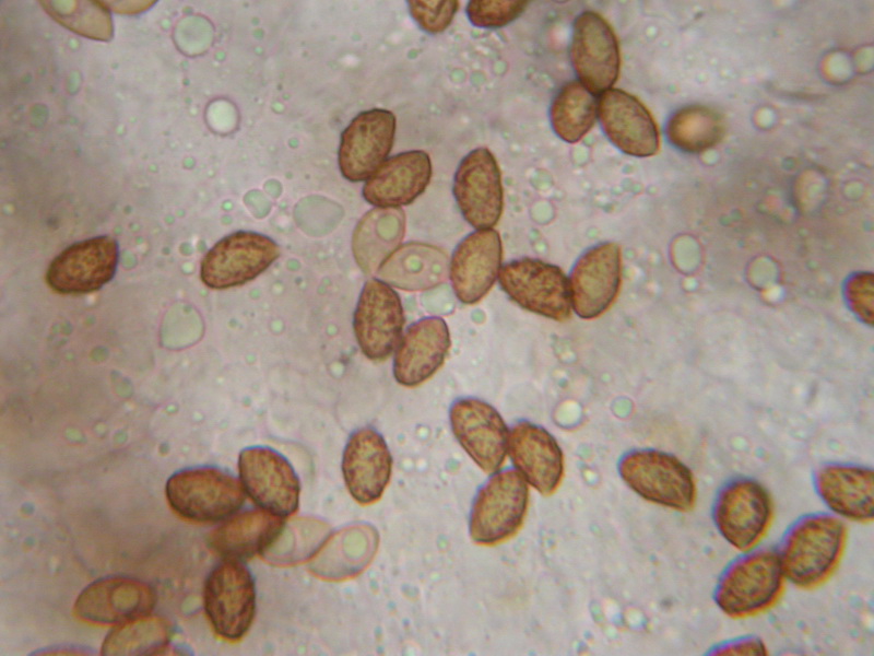 Sporen: ellipsoid, subapikulär abgeflacht, Apex meist mittelbreit gerundet; sehr grob warzig, Warzen dick und im Umriss deutlich überstehend (bis ca. 0,5 µm), indextrinoid; Maße: 7,3 x 4,7 (6,5-8 x 4,5-5), Q=1,57 (1,44-1,78), 20 Sp. gemessen;