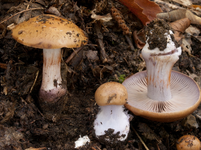 Stiel: bis 5,5 x 1,5 cm, basal schwach gerandet knollig, jung blass lila, dann cremeweiß; Knolle meist nur schwach gerandet, bis 2,4 cm breit, basal tief konisch eingesenkt, aber nicht zugespitzt; Velum am Knollenrand blass lila;
