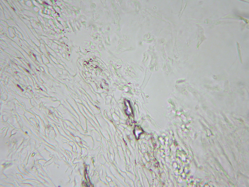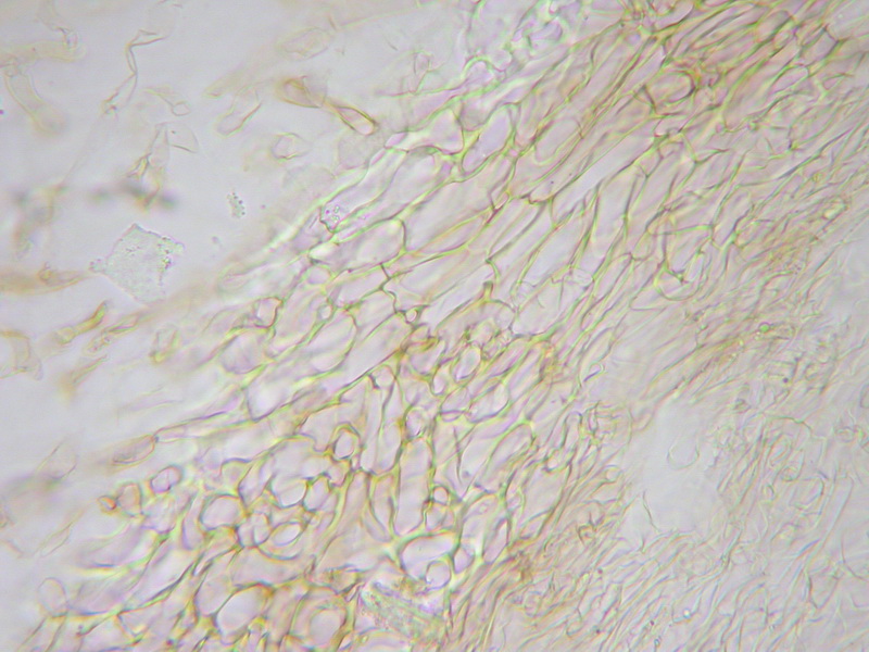 HDS: dicke Ixocutis, Zellen in den obersten Lagen sehr schmal, fädig (2-4), hyalin; Zellen überm Hypoderm etwas breiter (bis 8) und fein quergestreift blass gelbbraun inkrustiert; Hypoderm mäßig stark ausgeprägt; Zellen ca. bis 15 µm breit, mit blass gelbem, nicht inkrustierendem Dickwandpigment;