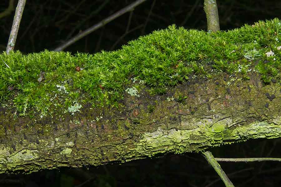 Ein etwa 70 cm dicker, abgeknickter und vorwiegend bemooster Stamm, auf dessen teils mehr als armdicken Ästen auf ca. 1,5 m Höhe die