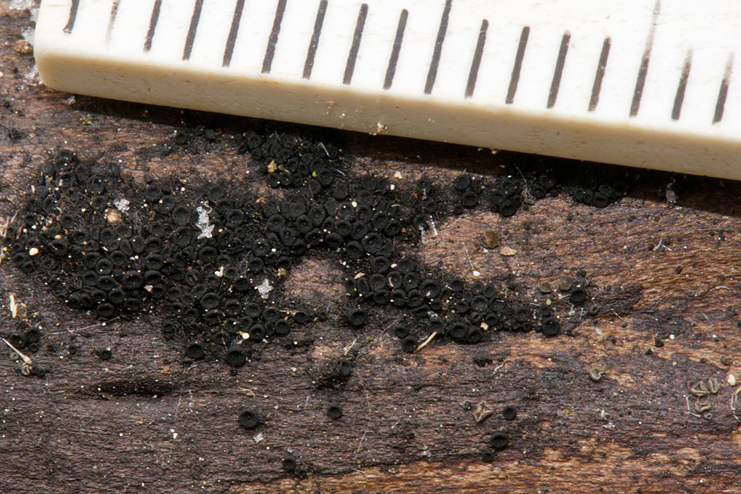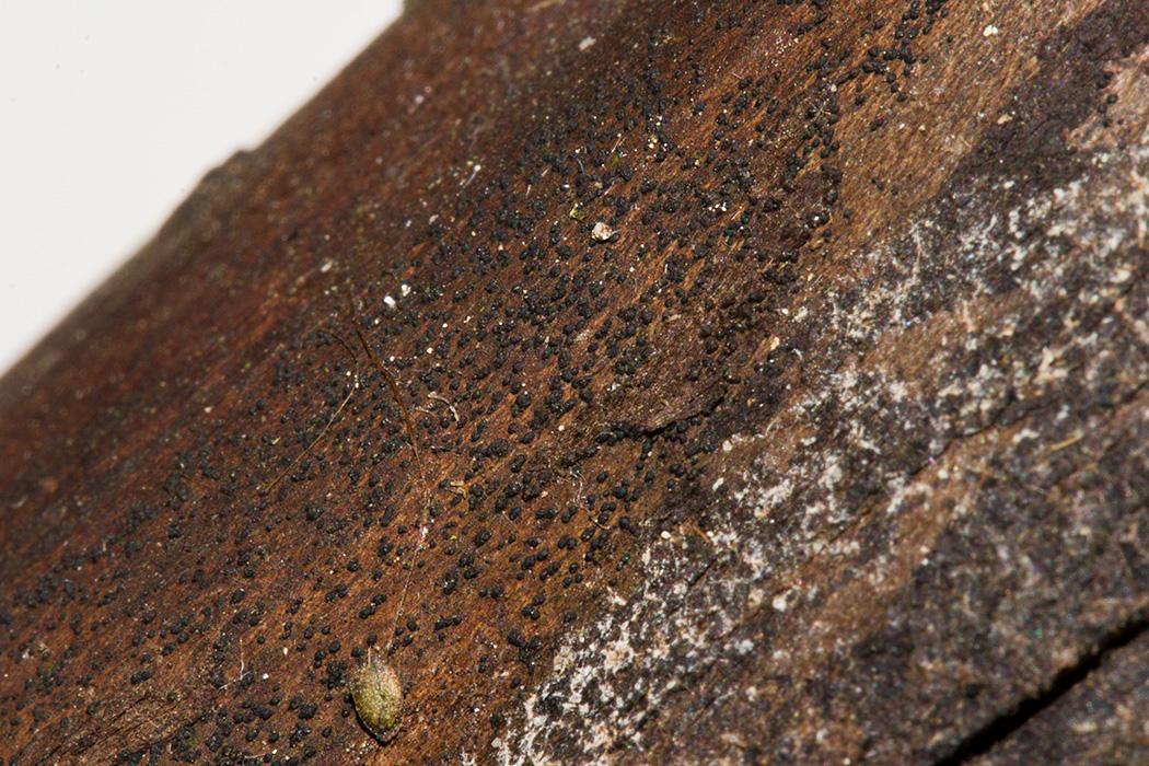 Diesmal zweifle ich aber keineswegs an meiner Bestimmung, sondern bin sicher, dass ich alles durcheinander bringe. Die Pilze fand ich gestern unter der Kirsche mit den Craterocolla-Pyknidien, an einem etwa 5 cm dicken, am Boden