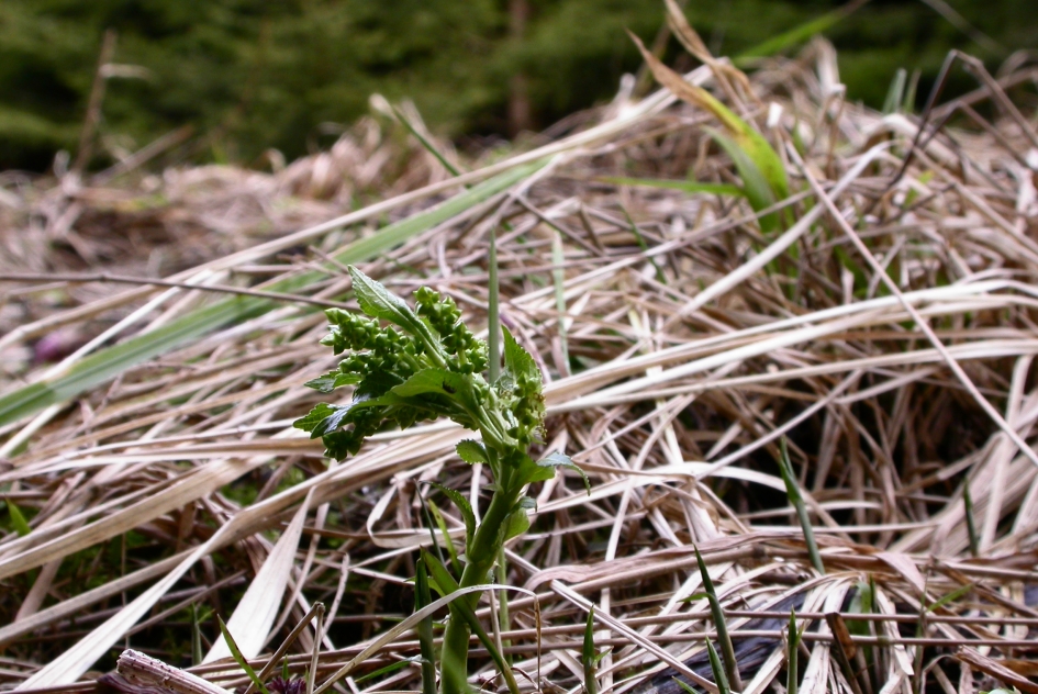 Das Bingelkraut schiebt sich soeben aus dem Boden.