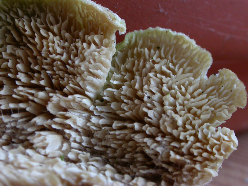 Hallo Rika, bei deinem "Stacheling" handelt es sich tatsächlich um Irpex lacteus! Der Fund hat leider nicht mehr abgesport, aber das plattige (irpicoide) Hymenium, die fehlenden Schnallen und die Zystiden mit abgerundetem Apex sprechen eindeutig für die Art. Ich habe unten noch ein Foto von der Hutunterseite angehängt. Mikrobilder kann ich auch noch liefern. Steccherinum oreophilum hat Schnallen und spitz endende Zystiden. Spongipellis pachyodon ist monomitisch.