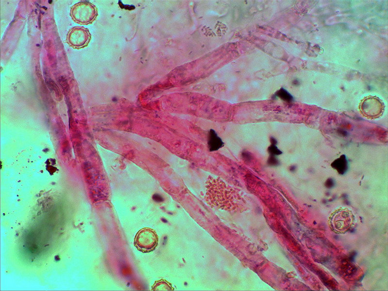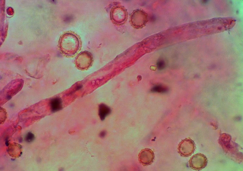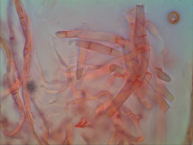 Hallo Stefan und Pilzfreunde ich habe mir die Tauben angeschaut, und wenn ich die Wahl zwischen turci und ceccans habe, würde ich auf turci tendieren. Die Sporen beider Arten sehen ja ziemlich ähnlich aus, für ceccans ist mir aber das Ornament nicht hoch genug. Danach fertigte ich in Kongo ein Bild der Hutelemente an und glaubte septierte Zystiden zu sehen. Aber in SV färbte sich nichts dunkel. Anschließend in Karbolfuchsin und HCL auswaschung die zwei restlichen Bilder, wie typische Inkrustationen sieht das aber auch nicht aus. Irgendwas muß ich da falschmachen, vielleicht sollte ich ein Hautstückchen von der Mitte des Hutes entnehmen?