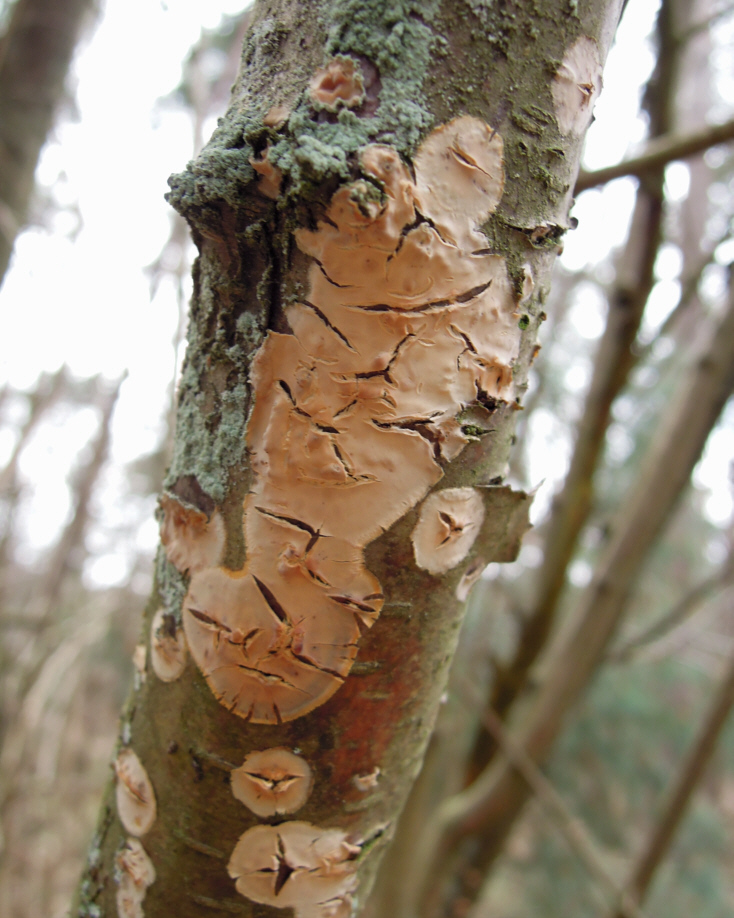 Hallo allerseits, habe heute im Wald einen Pilz gesehen (und fotografiert), der an Hasel wuchs. Lang am Stämmchen runter in mehr oder weniger großen Flecken. Obwohl er nicht besonders fleischrot ist, tippe ich auf Peniophora incarnata (Fleischroter Zystidenrindenpilz). Was haltet ihr davon? Funddaten: Deutschland, NRW, bei Gütersloh, Mischwald, an Hasel (Fotos: Günter Eich, 03.04.2013) Viele Grüße – und vielen Dank schon mal