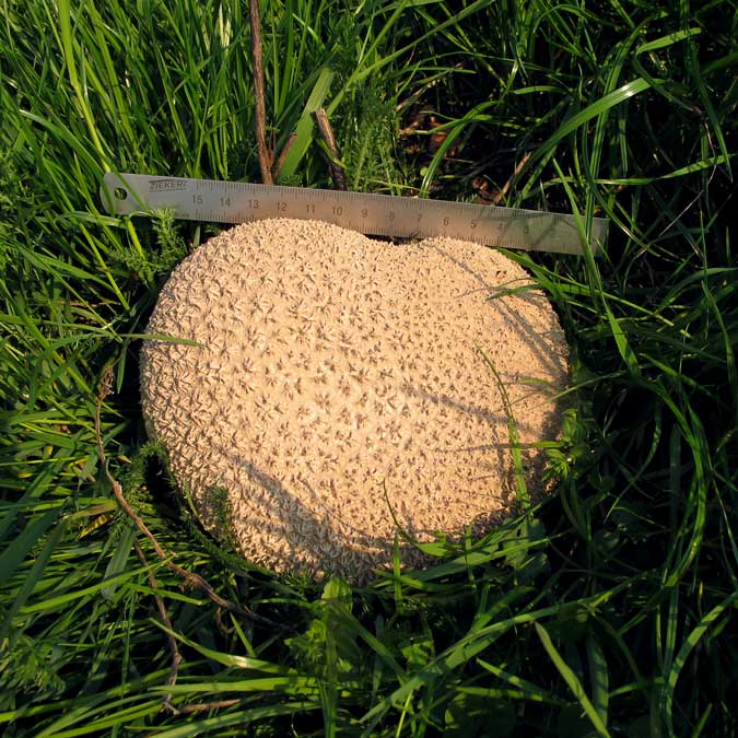 Hallo Zusammen, Rudi hat dann im zweiten Anlauf das Rennen gemacht. Ich habe auch nicht schlecht gestaunt als ich über diese großen "Kugeln" des Hasenstäublings Handkea utriformis fast wortwörtlich gestolpert bin. Um diese Jahreszeit hatte ich mit sowas nicht gerechnet. Die Wiese sah auch ganz gewöhnlich aus. Mehr als 10 Fruchtkörper verteilten sich in einem schönen Halbkreis, dessen Durchmesser ich auf gut 30m schätzen würde. So einen großen Hexenring hab ich noch nicht gesehen. Wirklich beeindruckend! Hat eigentlich jemand ne Ahnung wie schnell sich ein Hexenring bzw. sich das Mycel ausbreitet? Unten noch das Foto des gesamten Fruchtkörpers. Gruß Joschi