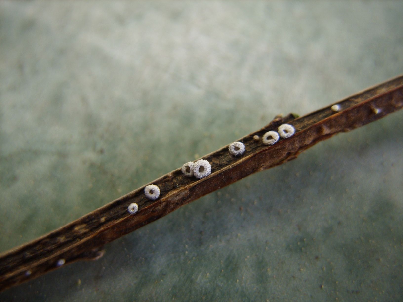 Am letzten Vatertag fand ich an Ginster bis zu 1 mm große, weiße Flecken, die sich unter der Lupe als leicht geöffnete, becherförmige, weiße Wollknäuelchen erwiesen. Gewässert vergrößerten und öffneten sie sich auf zwei mm max. Die Innenfarbe der Becherchen erwies sich als umbra. Auf das Mikroskopieren der Kleinteile habe ich verzichten müssen. Einen geeigneten Schlüssel, diese UMOs zu enttarnen habe ich auch nicht. Wer ist diesbezüglich schlauer als ich und kann mir einen Hinweis zur richtigen Gattung weisen? Mit Dank im Voraus, Peter! Ein Foto vom Fundtag anbei; ein weiteres vom vierten Tag separat.