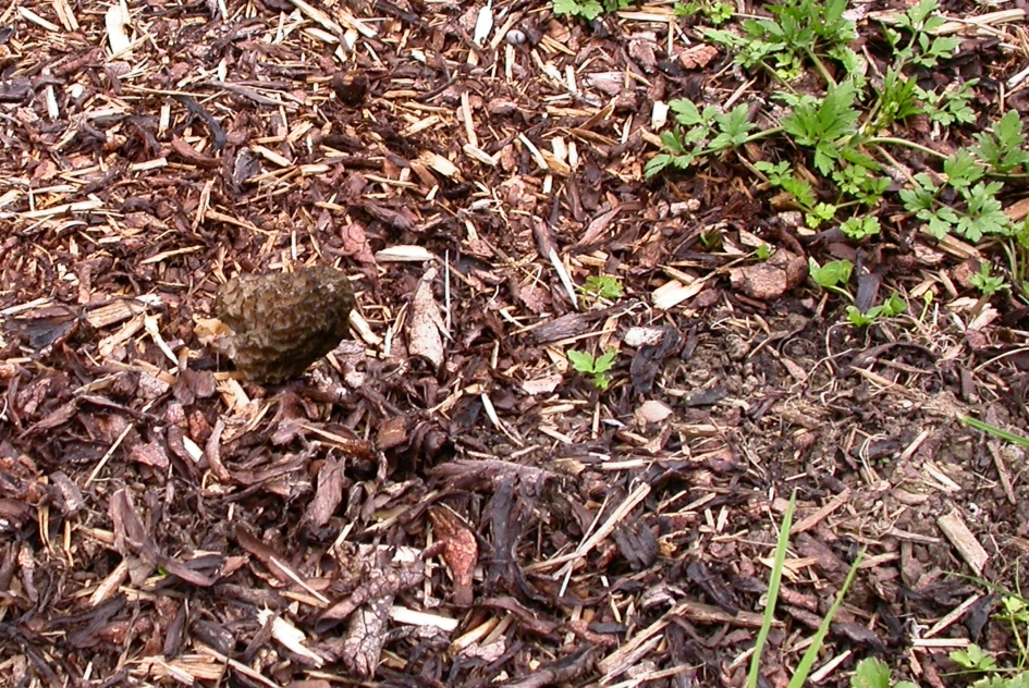 Am Ende des Mulchstreifens drückte sich eine einzige Spitzmorchel aus dem Mulch,