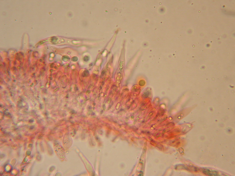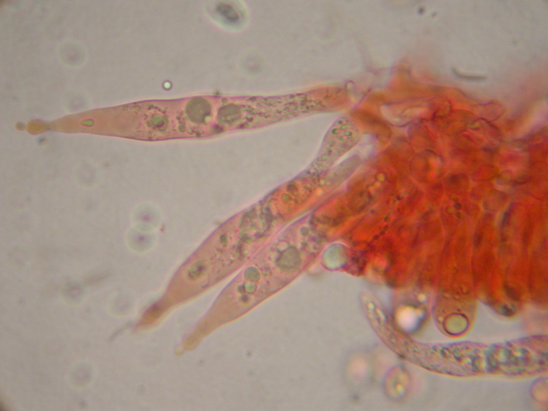Cheilomakrozystiden: sehr zahlreich, schmal fusoid, Apex spitz und oft doppelt zipfelig eingeschnürt, ca. 52-85 x 7-10;