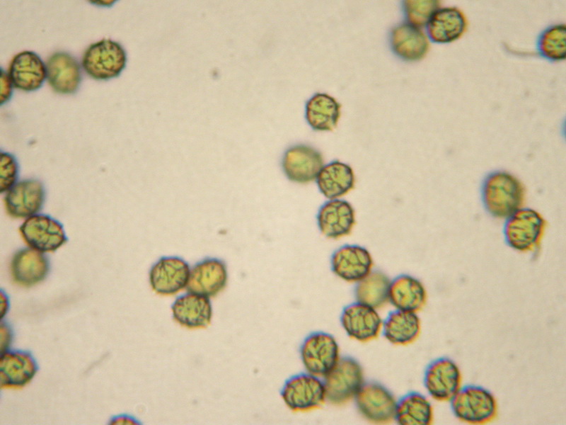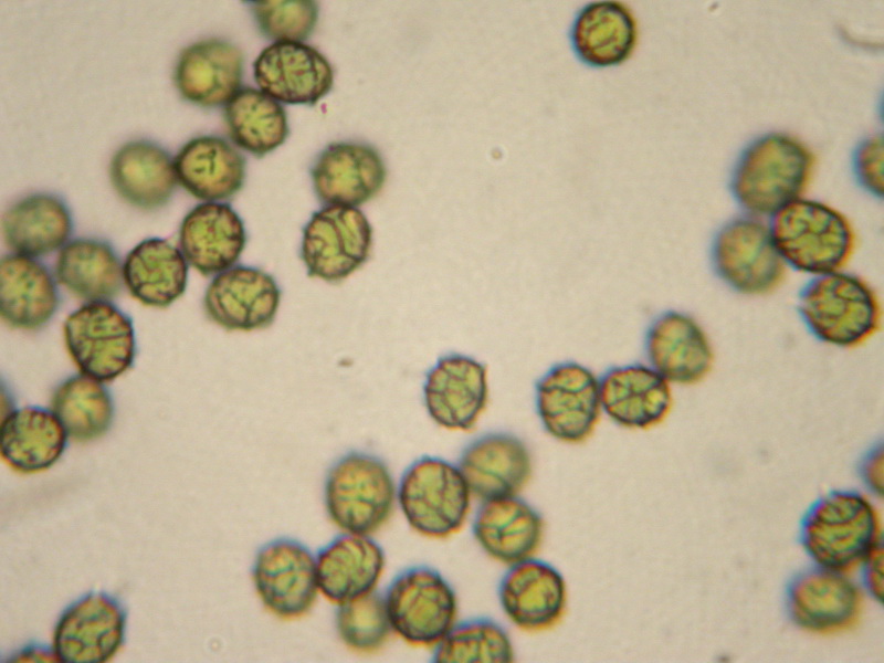 Sporen: breit ellipsoid; Ornament aus einzelnen, meist verlängerten Warzen und oft sehr langen Graten, Maschen nur ganz sporadisch, Grate oft recht schütter angeordnet, selten zebramusterartig, ca. 0,5 µ hoch; Maße: 7,5 x 6,1 (6-9 x 5-7), Q=1,22 (1,08-1,42);