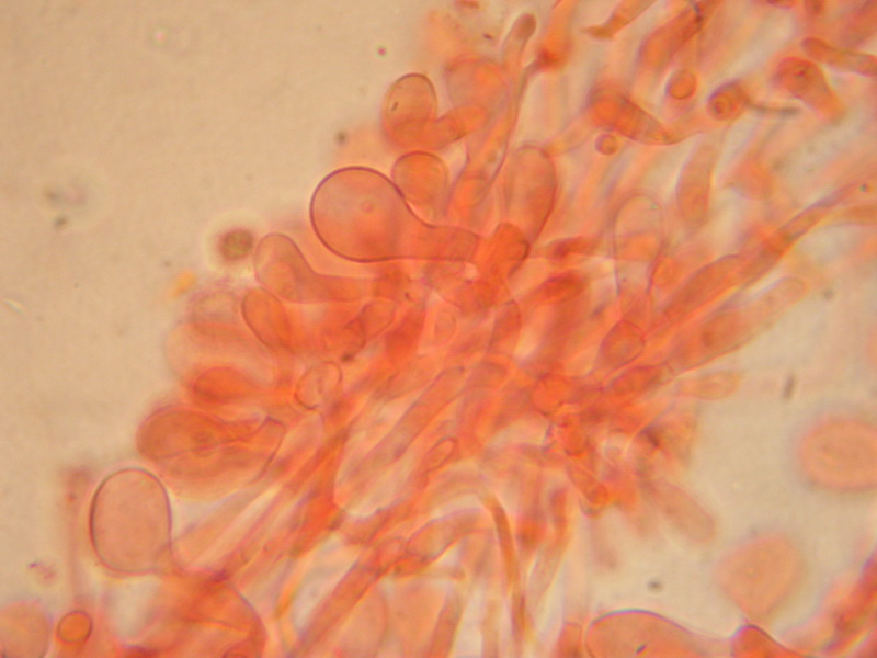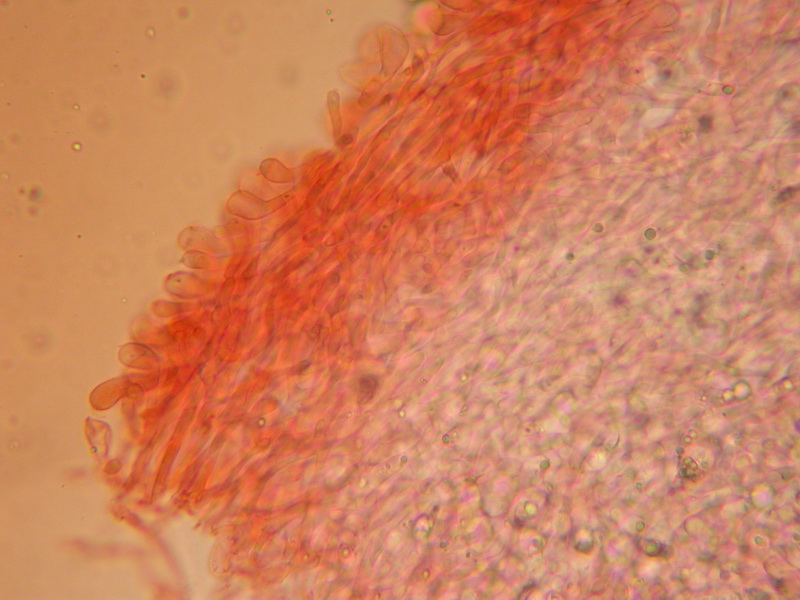LS: steril, mit dicht angeordneten, schlank bis breit keuligen Marginalzellen (ca. 15-32 x 9-12, auch viel kleiner), die aus einem Strang verwobener schneidenparalleler, schmaler Zellen entspringen; keine Makrozystiden beobachtet, auch nicht an der Fläche;